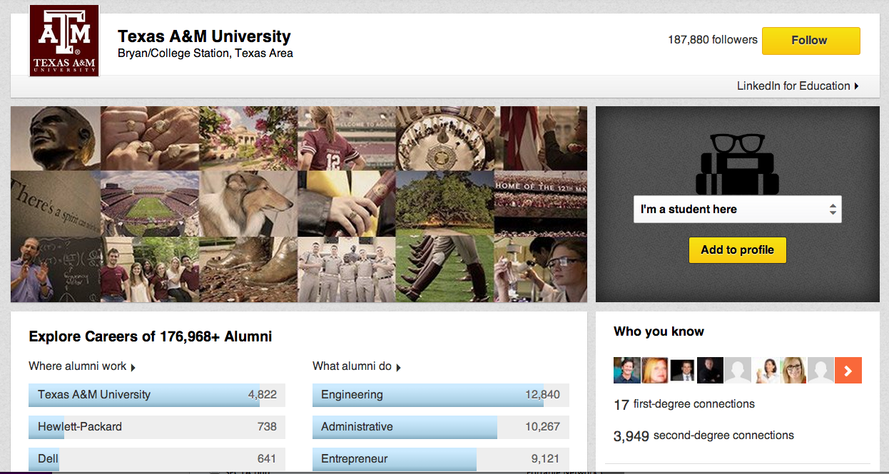 Here’s an example of an University Page from Texas A&M University. Future students considering Texas A&M can explore the careers of alumni and see which fields of expertise the alumni are known for and also find top employers. Prospective students can find campus news and activities. They can also get connected and engage with the campus community.
